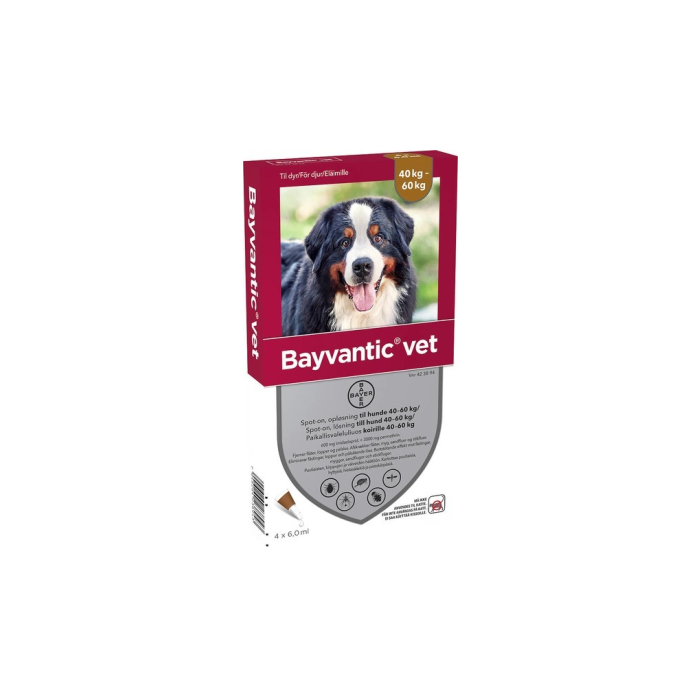 Bayvantic vet paikallisvaleluliuos koirille 40-60 kg on koirien ulkoloislääke, joka tehoaa ja antaa suojaa puutiaisia, hyttysiä, hietasääskiä, pistokärpäsiä ja kirppuja vastaan. Ulkoloisia tappava sekä karkottava vaikutus kestää jopa neljä viikkoa. Bayvanticin teho perustuu kahteen vaikuttavaan aineeseen, imidaklopridiin ja permetriiniin. Valmiste säilyttää tehonsa myös koiran kastuessa, esimerkiksi pesun aikana tai koiran uidessa. 4 viikkoa Ixodes ricinus ja Rhipicephalus sanguineus -punkkeja vastaan 3 viikkoa Dermacentor reticulatus -punkkeja vastaan 2-4 viikkoa hyttysiä vastaan lajista riippuen 2 viikkoa hietasääsket (Phlebotomus papatasi) 4 viikkoa pistokärpäsiä (Stomoxys calcitrans) vastaan Koirassa olevat kirput kuolevat vuorokauden sisällä hoidosta, yksi hoitokerta riittää estämään uudet kirpputartunnat 4 viikoksi.