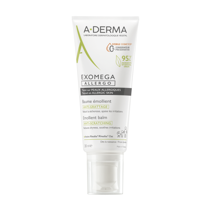 STERIL CRÈME FÖR TORR HUD SOM ÄR BENÄGEN TILL ATOPI OCH ALLERGI. FÖREBYGGER KLÅDA OCH LUGNAR HUDIRRITATION. MINSKAR HUDENS TORRHET. Tack vare de naturliga aktiva ingredienserna Rhealba® havregräs-extrakt, BioVect® & Filaxerine® har Exomega ALLERGO dokumenterad effekt för torr hud som är benägen till atopi och allergi.