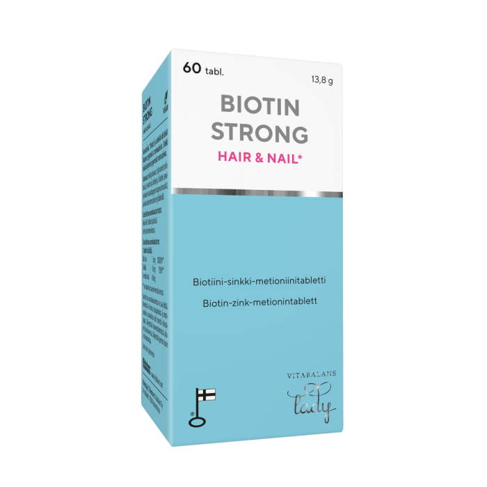 Biotin Strong Hair&Nail är en stark biotinprodukt som ger livskraft till hår och naglar, och som förutom biotin även innehåller zink och metionin. Biotin är ett viktigt vitamin för hårtillväxt och förnyelse. Byggstenen för hår och naglar är keratin, ett fibröst protein som innehåller svavel, och produktens sammansättning kompletteras av svavelhaltiga metionin-aminoacider. Zink, som stöder välbefinnandet hos hår och naglar, ser till att upprätthålla det normala tillståndet hos hår och naglar.